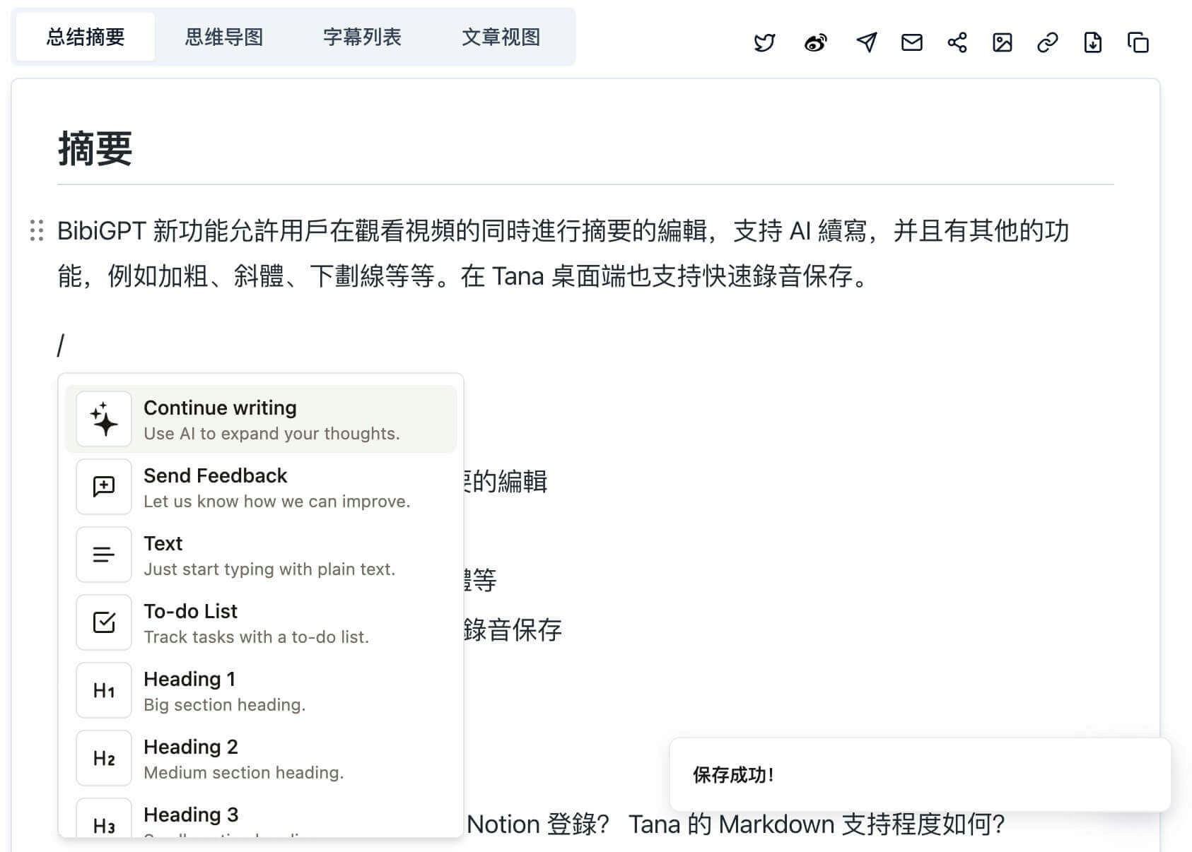 斜杠命令是一种快速访问 BibiGPT 工具箱的方法。当在文档中输入斜杠(/)时,会弹出一个命令菜单,你可以选择需要的功能,如插入图片、创建链接、格式化文本等。这些命令均设计为直觉式操作,让用户不需要离开键盘就能执行多种任务。AI 续写