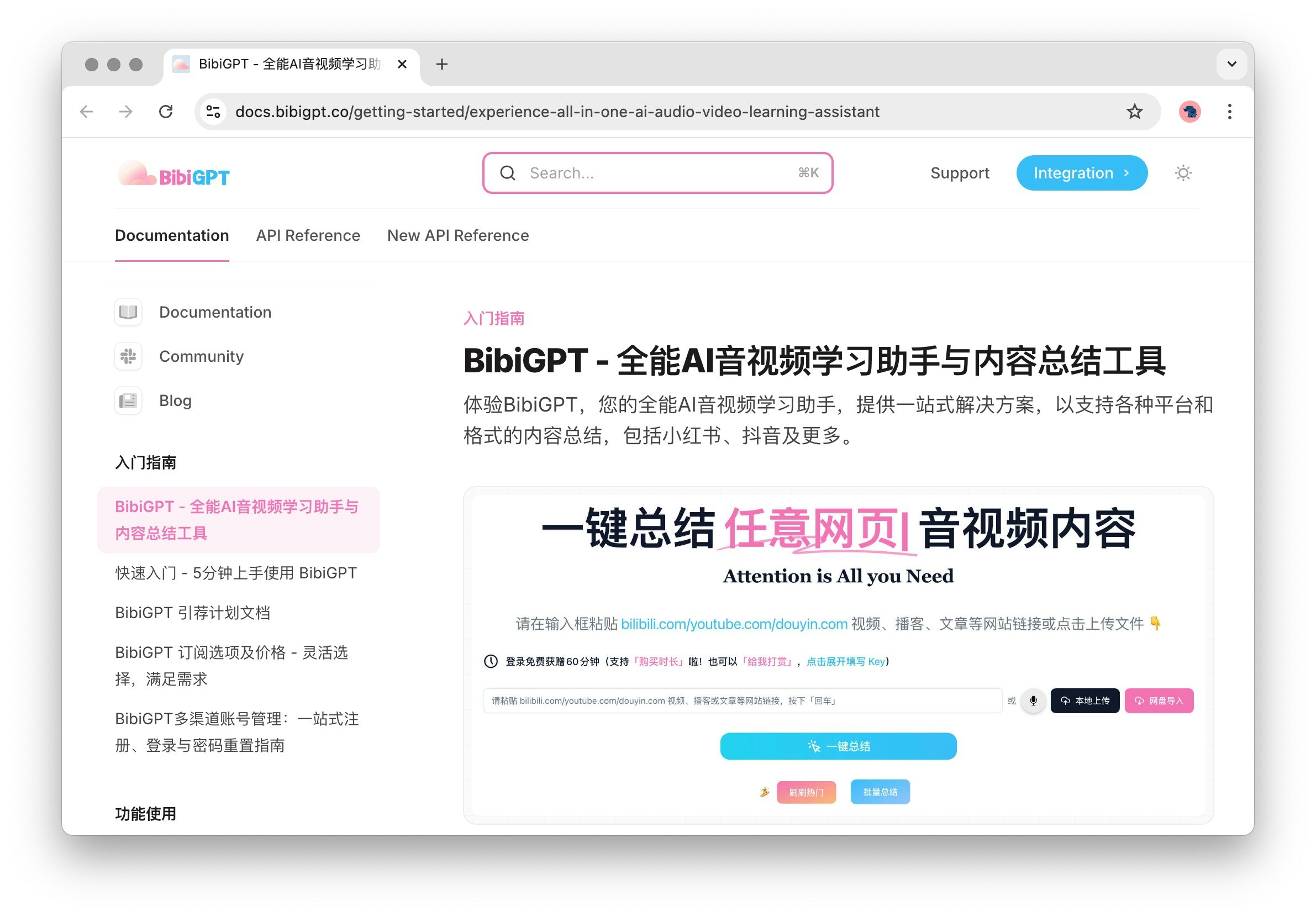帮助与支持区包括以下选项,确保您在使用BibiGPT时能够获得必要的帮助:-