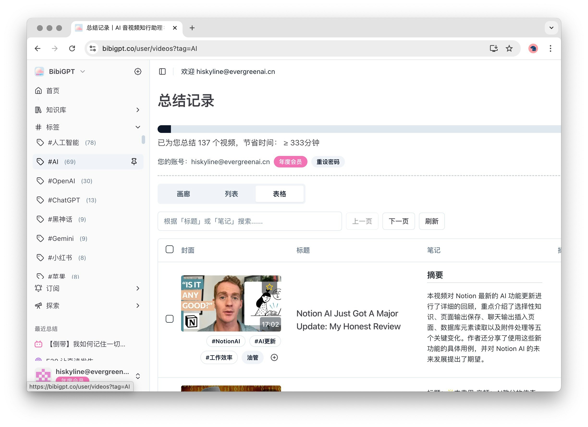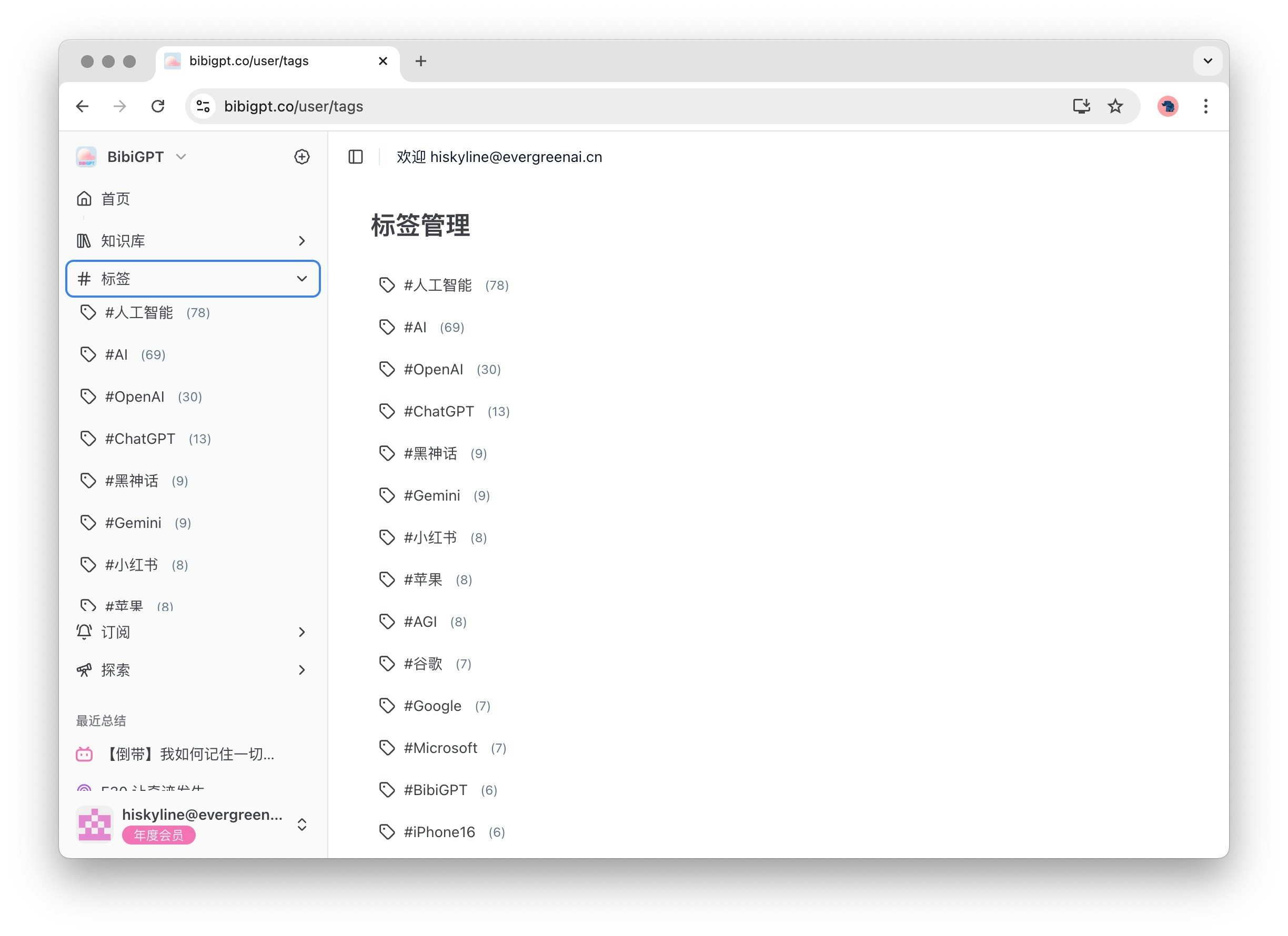 标签功能可以帮助您更好地管理和分类视频内容。展开后,二级菜单会显示视频的标签列表及对应数量,这些标签是BibiGPT根据视频内容自动生成的,便于您快速找到相关主题。